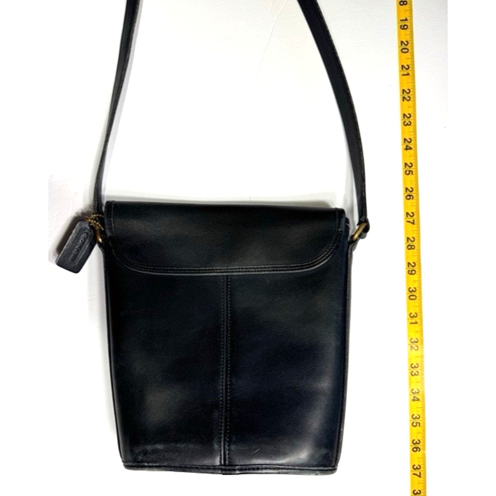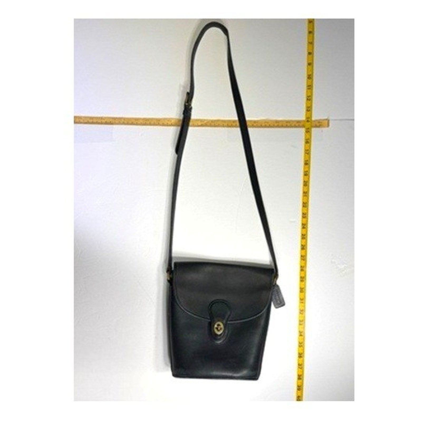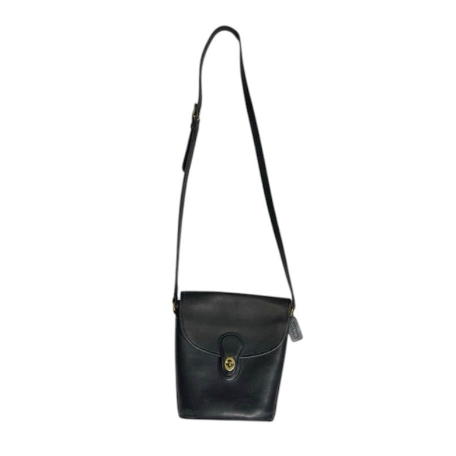 The Vintage Coach Bradley Bucket Bag with Brass Turnlock is a stylish crossbody handbag made from black leather with gold hardware accents. This rectangular-shaped bag features a turn lock closure, a black leather crossbody strap, and a green leather lining.