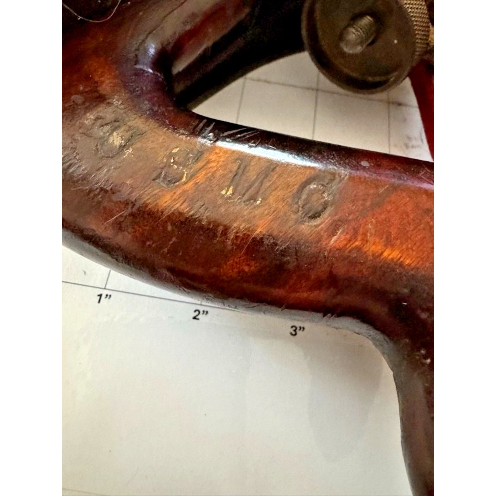 WWII-era Millers Falls No. 9 Smooth Plane Made in U.S.A with USMC property marking on tote (unverified military provenance). Millers Falls branded lever cap Vintage Millers Falls smoothing plane #9. Features the classic arched MILLERS FALLS lever cap and Pat. No. 1,822,520 marking. The tote is stamped USMC - this appears to be an ownership/property marking and not a factory marking (military provenance unverified but the plane was once owned by WW2 Naval Engineer and veteran who believed this stood for Unite States Marine Corps).